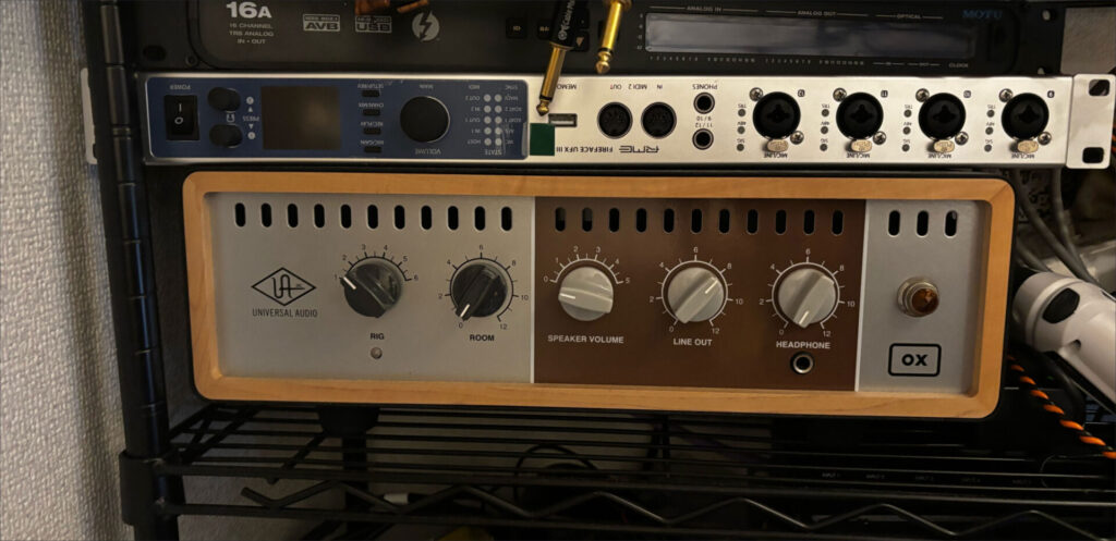 宅録したLINE録音のギターの音をリアンプボックスを使用して実機のアンプヘッドとキャビネットシミュレーターを通すことで、リアルなギターサウンドにリアンプします。